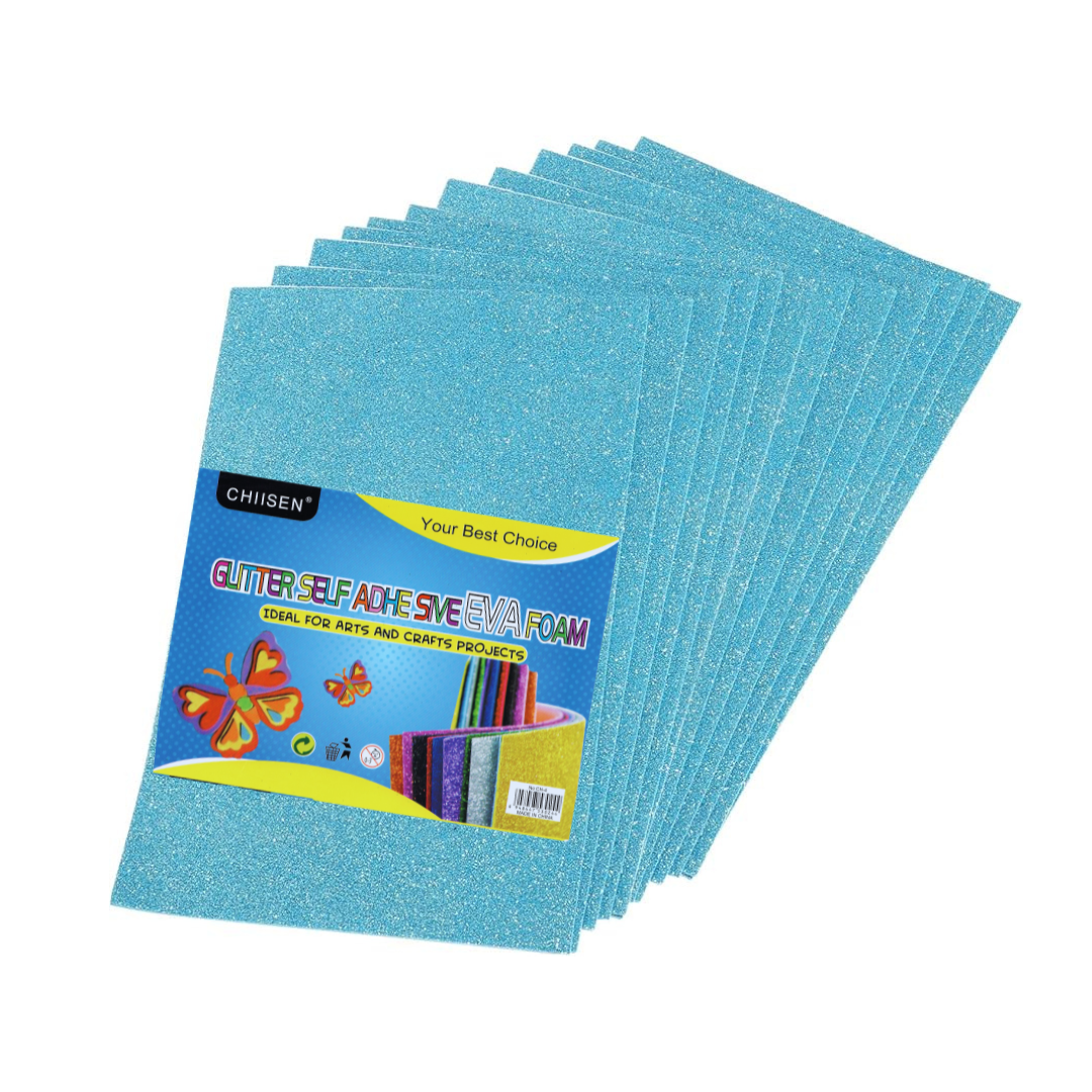 - Introducing a luxurious set of 10 glitter-infused, self-adhesive EVA foam sheets, each 30cm x 19 cm.